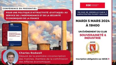 Conférence Souveraineté et Industrie Le Club Industrie & Souveraineté de l’AEGE - Le réseau d'experts en intelligence économique vous convie à sa conférence pour discuter du rapport “Pour une politique d’attractivité «d’attaque» au...