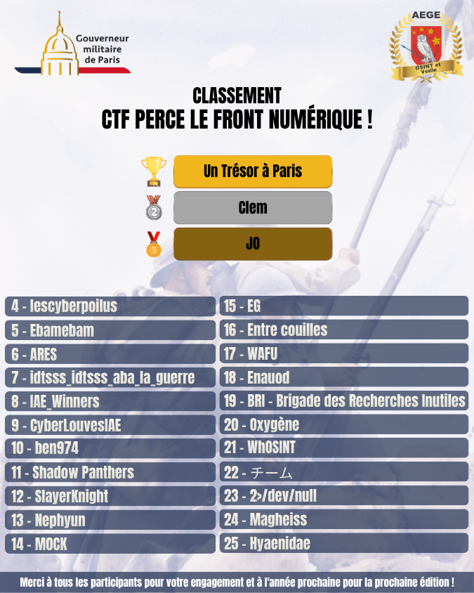 👉 Le Club OSINT & Veille de l’AEGE est fier de dresser le bilan du CTF « Perce le front numérique ! », créé en partenariat avec le gouverneur militaire de Paris, qui s’est tenu du 25 septembre au 17 octobre 2025 !
